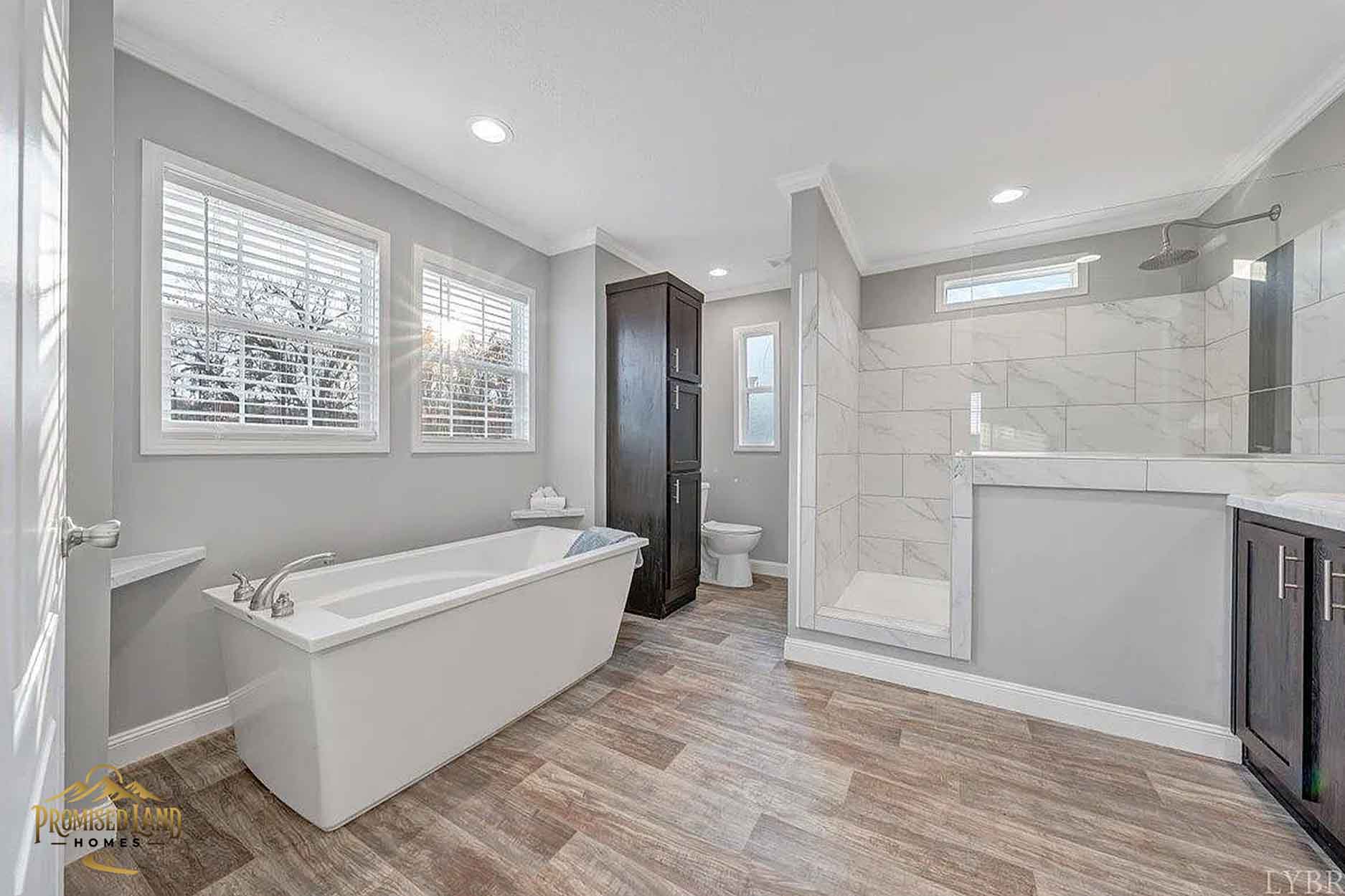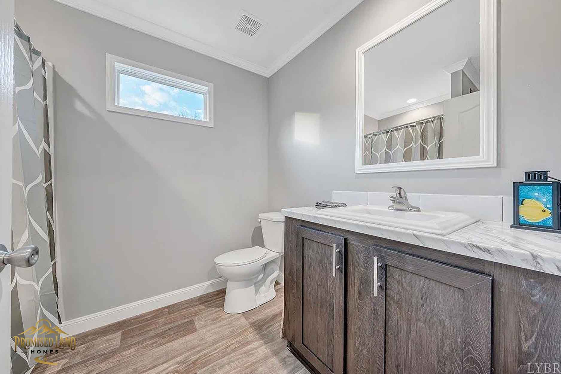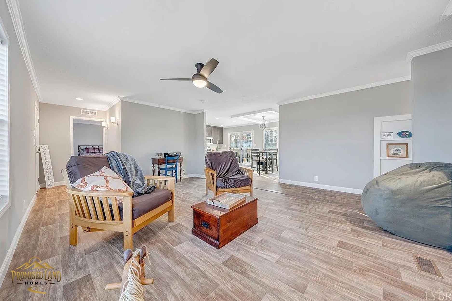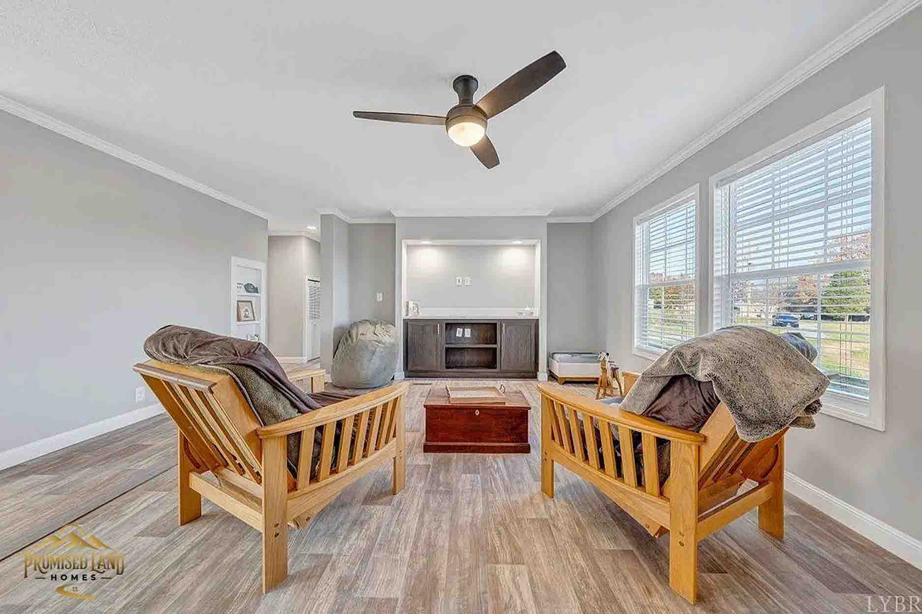 This manufactured home, built by Promised Land Homes, presents a welcoming façade with light gray horizontal siding accented by bright white trim. The exterior features a prominent gabled roof covered in dark shingles, enhancing the home’s clean, classic silhouette. Five windows are symmetrically arranged along the front, two paired on the left side of the porch, two paired to the right and a single window on the right, each framed with matching black shutters that complement the overall color scheme. The centrally located white entry door opens onto a modest covered porch, supported by four square white columns beneath a small gabled roof.