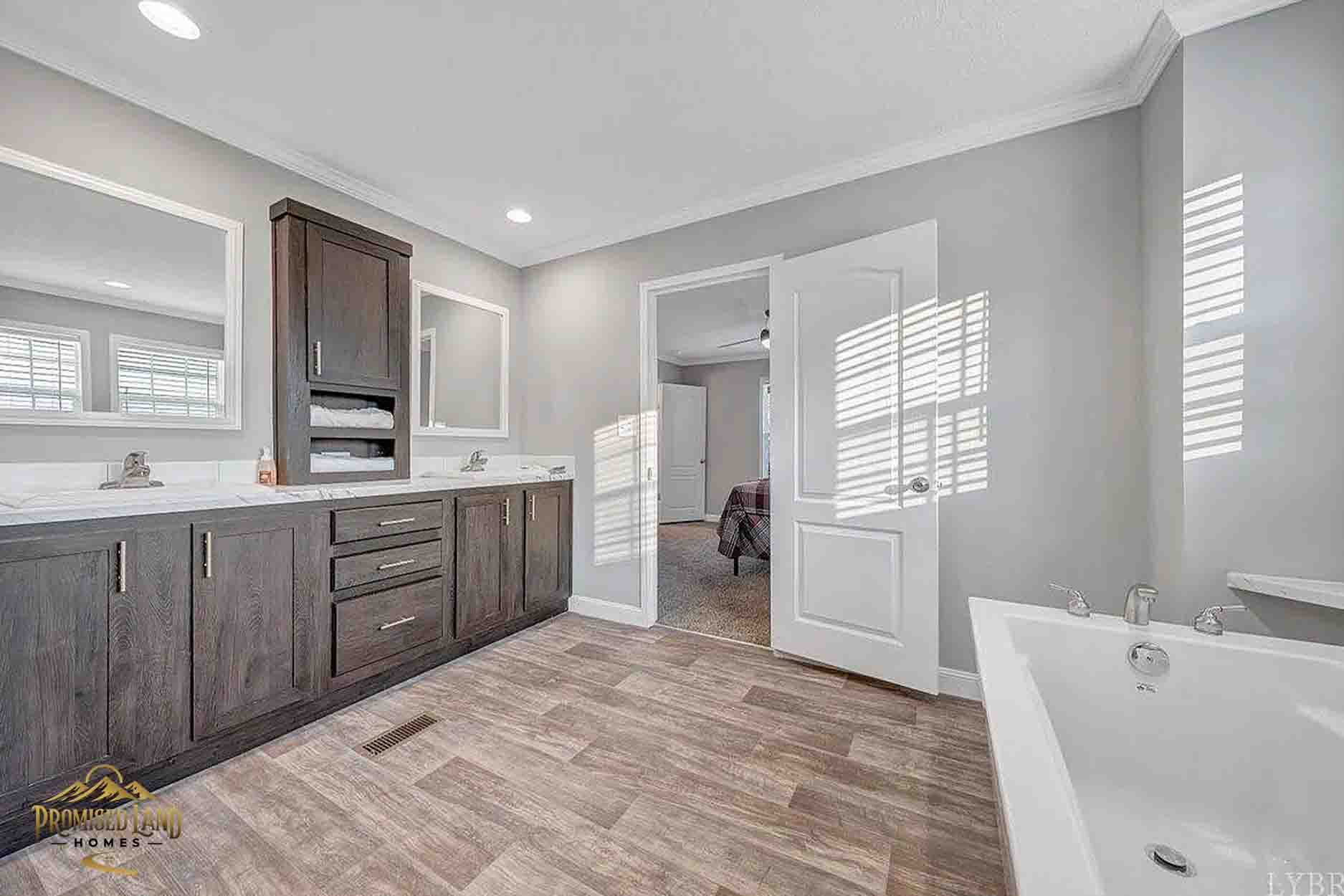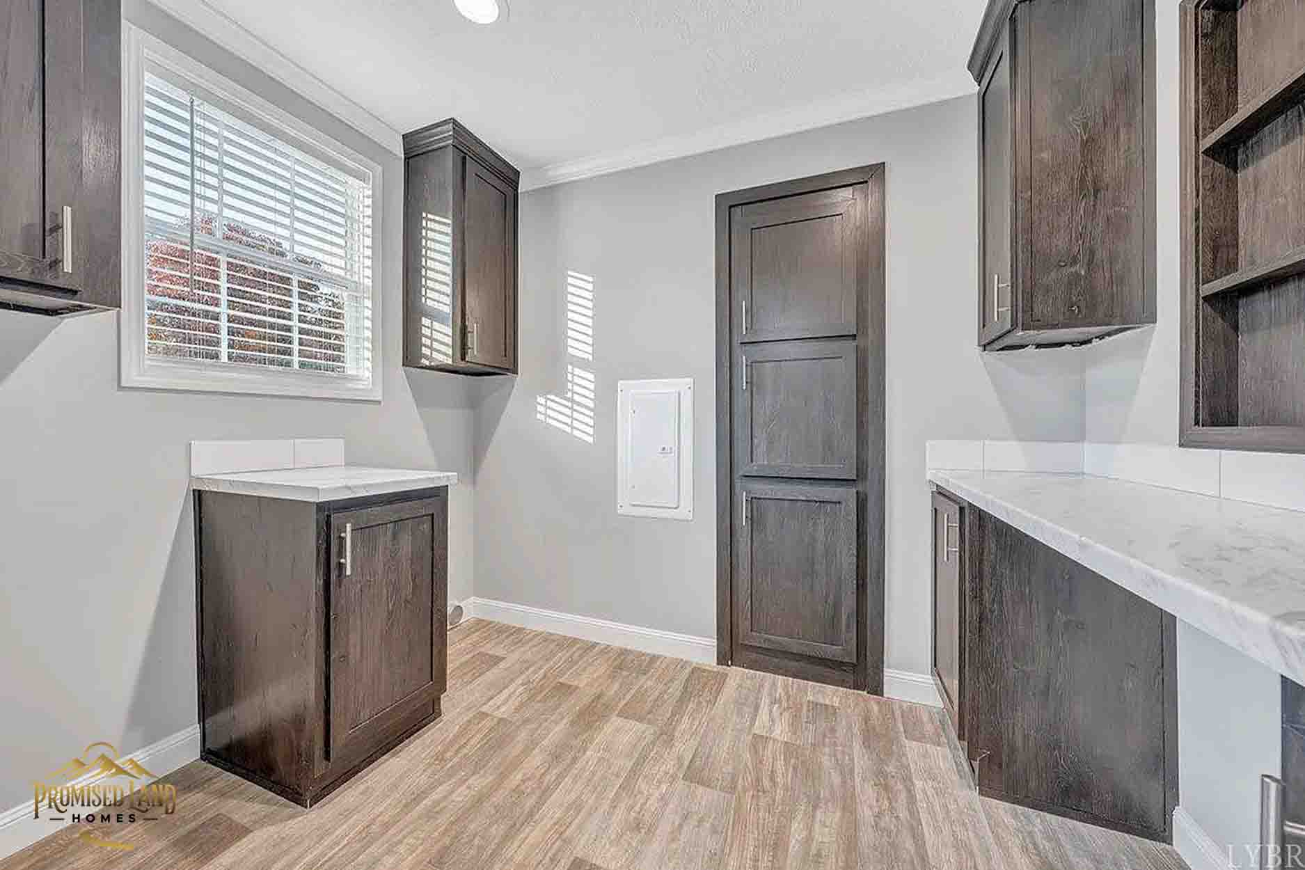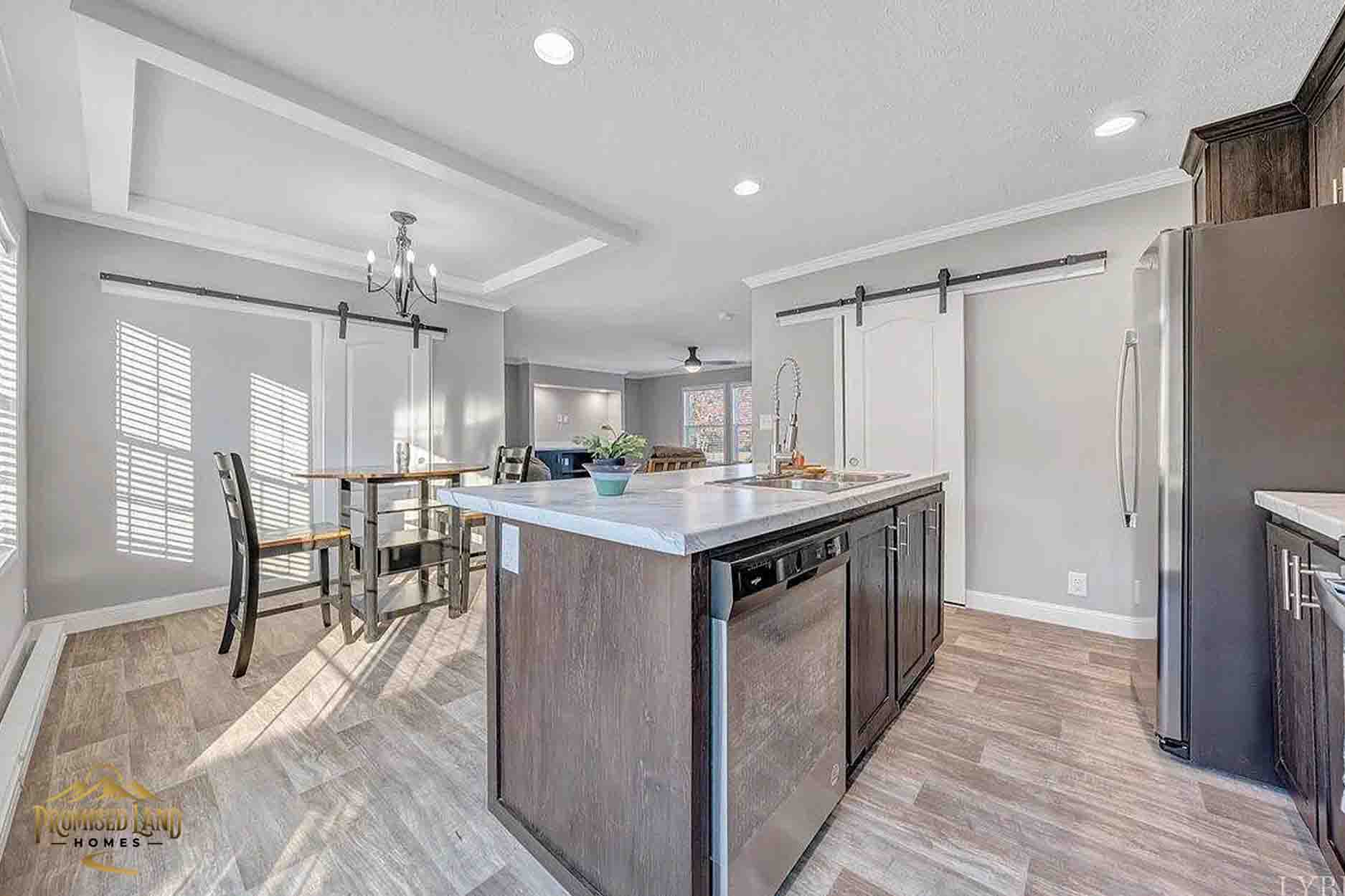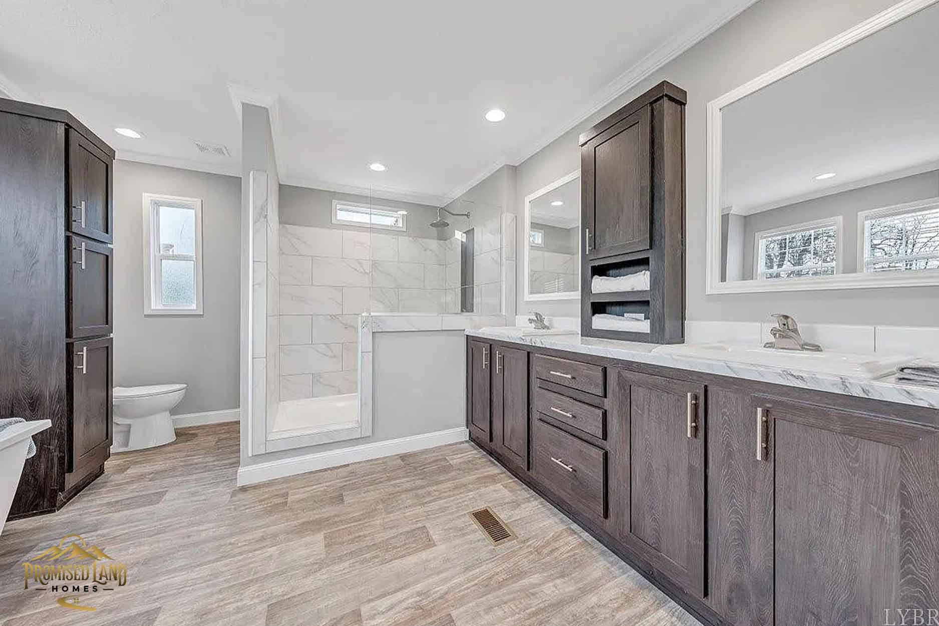 This manufactured home, built by Promised Land Homes, presents a welcoming façade with light gray horizontal siding accented by bright white trim. The exterior features a prominent gabled roof covered in dark shingles, enhancing the home’s clean, classic silhouette. Five windows are symmetrically arranged along the front, two paired on the left side of the porch, two paired to the right and a single window on the right, each framed with matching black shutters that complement the overall color scheme. The centrally located white entry door opens onto a modest covered porch, supported by four square white columns beneath a small gabled roof.