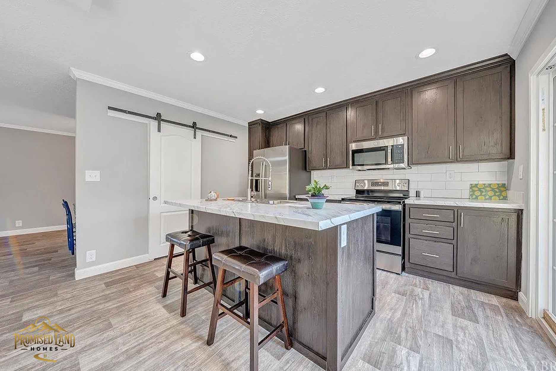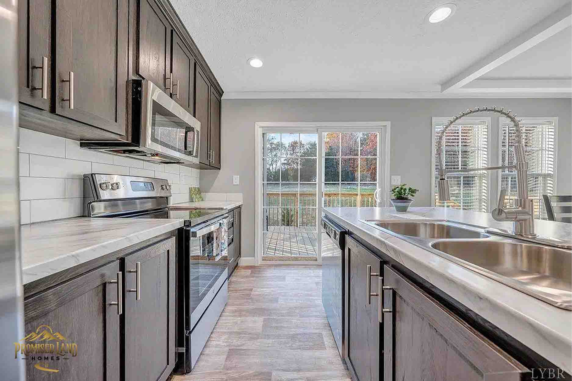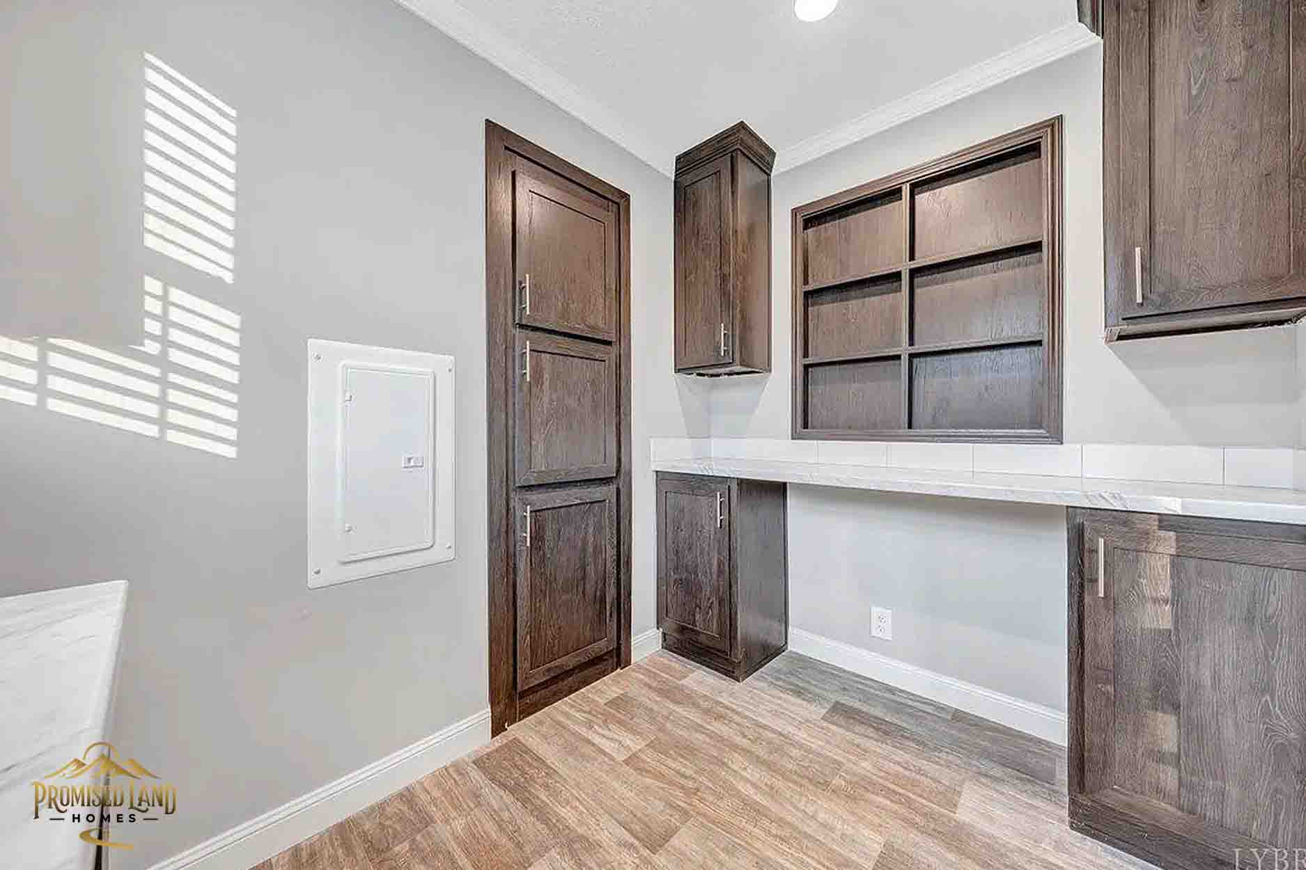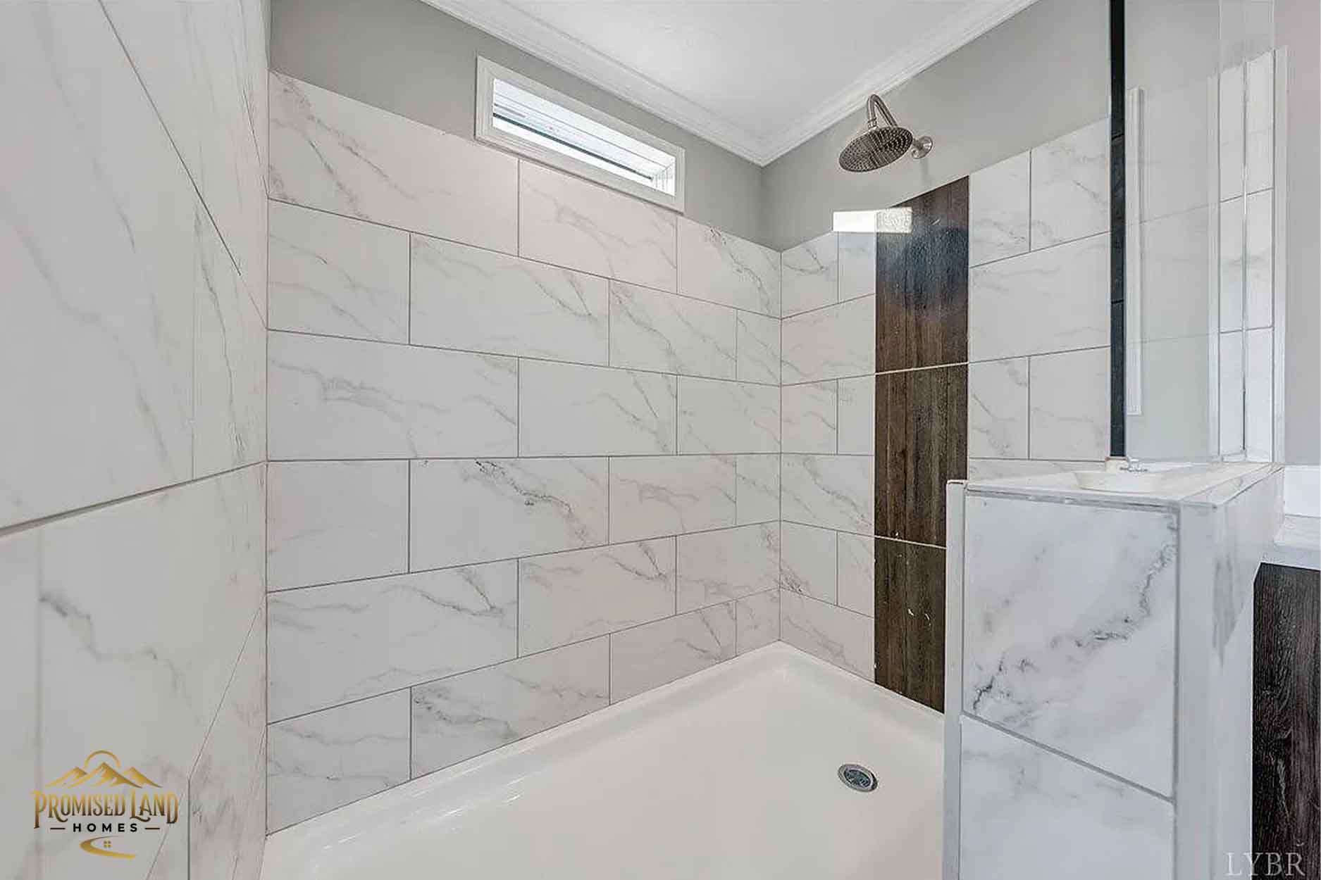 This manufactured home, built by Promised Land Homes, presents a welcoming façade with light gray horizontal siding accented by bright white trim. The exterior features a prominent gabled roof covered in dark shingles, enhancing the home’s clean, classic silhouette. Five windows are symmetrically arranged along the front, two paired on the left side of the porch, two paired to the right and a single window on the right, each framed with matching black shutters that complement the overall color scheme. The centrally located white entry door opens onto a modest covered porch, supported by four square white columns beneath a small gabled roof.